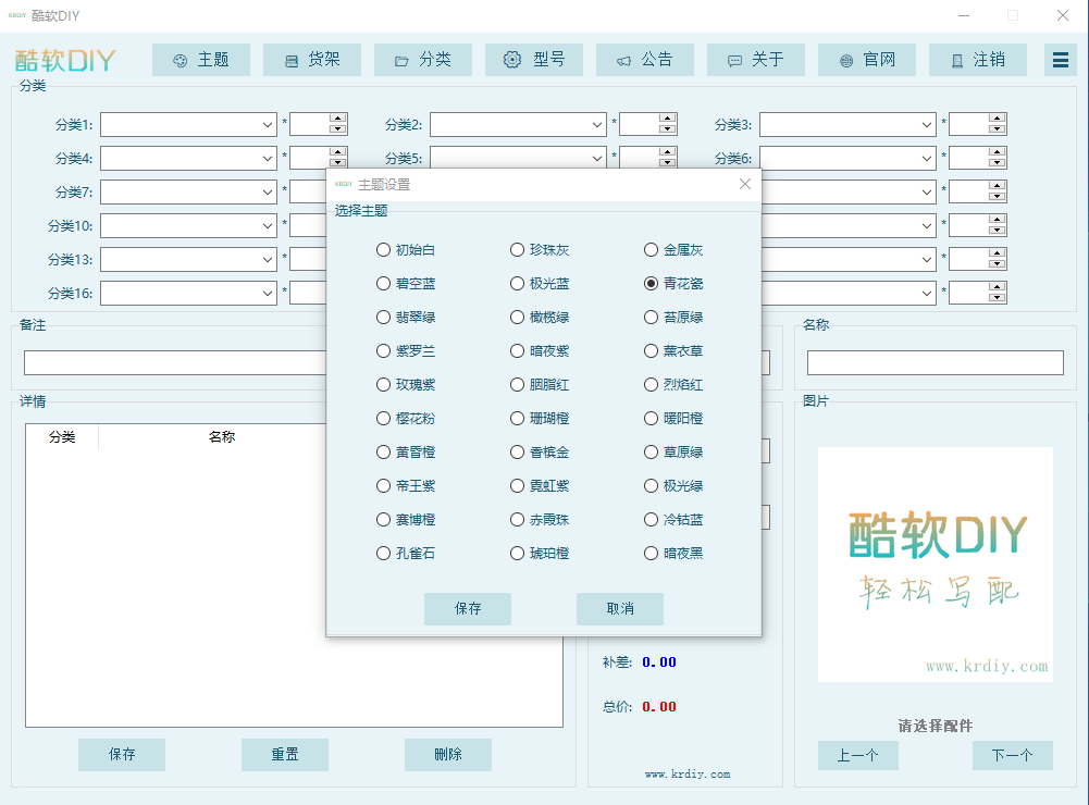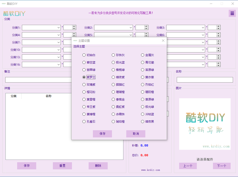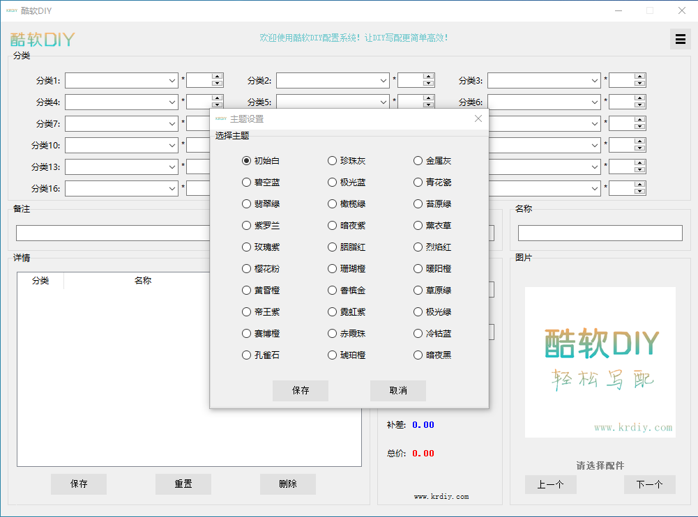 支持程序内一键修改主题 背景色、字体颜色、按钮颜色等全局配色一键修改。内置30中配色方案,快速设置想要的主题配色。 你想要更丰富的自定义? 没问题! 你可以在配置文件中自定义配色方案!(一般不建议修改,除非你熟知配色的代码!) 主题设置程序截图如下: